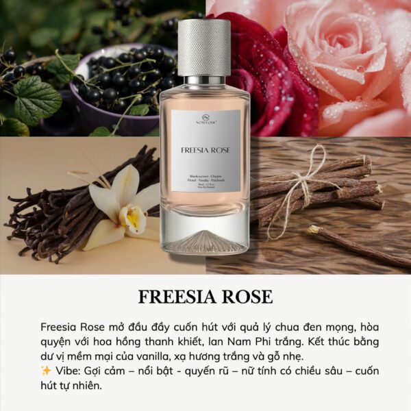 FREESIA ROSE (lấy cảm hứng từ Giorgio Armani Si Eau de Parfum) mở ra với sự tươi mới và ngọt thanh từ lý chua đen mọng nước, hòa quyện cùng hoa lan Nam Phi dịu nhẹ – mang đến cảm giác nữ tính và đầy sức sống.